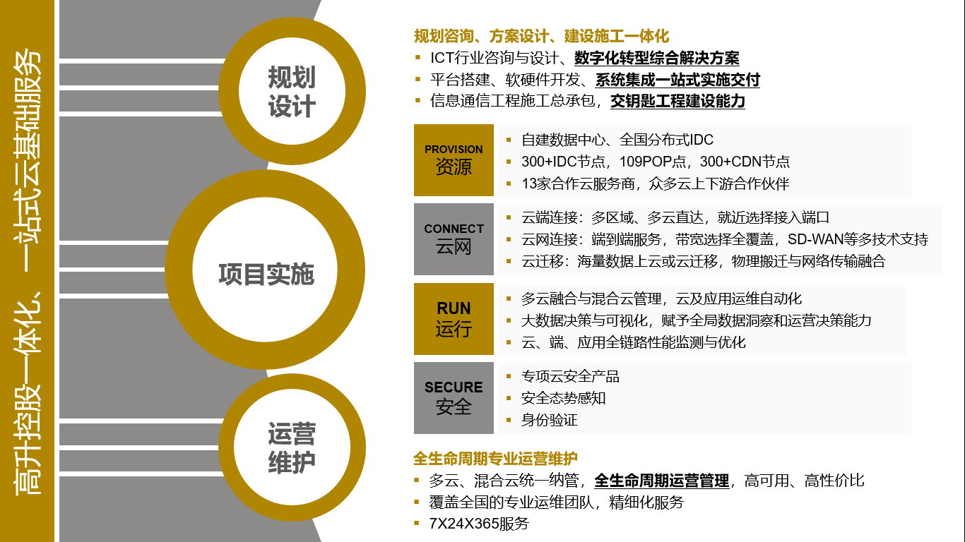 此外,高升控股也是國(guó)內(nèi)產(chǎn)業(yè)鏈布局最為完善的綜合云基礎(chǔ)服務(wù)商之一,能夠一站式提供ICT項(xiàng)目設(shè)計(jì)咨詢、建設(shè)實(shí)施與運(yùn)營(yíng)維護(hù)服務(wù),以覆蓋全國(guó)的300+IDC節(jié)點(diǎn)、300+CDN節(jié)點(diǎn)、分布在109個(gè)城市的大容量虛擬專用網(wǎng)平臺(tái)等資源為基礎(chǔ),結(jié)合自主研發(fā)的混合云管理平臺(tái)與可視化解決方案,同時(shí)聯(lián)合云產(chǎn)業(yè)鏈上下游,集成一體化綜合云基礎(chǔ)服務(wù),覆蓋企業(yè)IT全鏈路全生命周期,幫助企業(yè)實(shí)現(xiàn)業(yè)務(wù)智能高效、精益敏捷,為“互聯(lián)網(wǎng)+”落地及互聯(lián)網(wǎng)經(jīng)濟(jì)建設(shè)提供基礎(chǔ)服務(wù)和技術(shù)支撐。