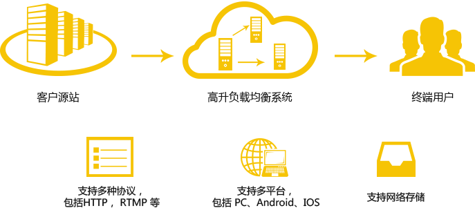 流媒體加速服務(wù)將以高升部署在全國各地的節(jié)點組成的加速平臺為基礎(chǔ),為客戶提供快速、穩(wěn)定和安全的流媒體分發(fā)服務(wù)。支持多種文件格式、編碼/傳輸協(xié)議以及點播及直播,客戶僅需提供可訪問的源服務(wù)器或源文件,用戶就可以在全國任何地方享受到最高品質(zhì)的流媒體體驗。
